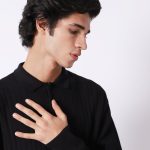 Slim fit shirt featuring lapel collar and long sleeves with buttoned cuffs. Front button closure.